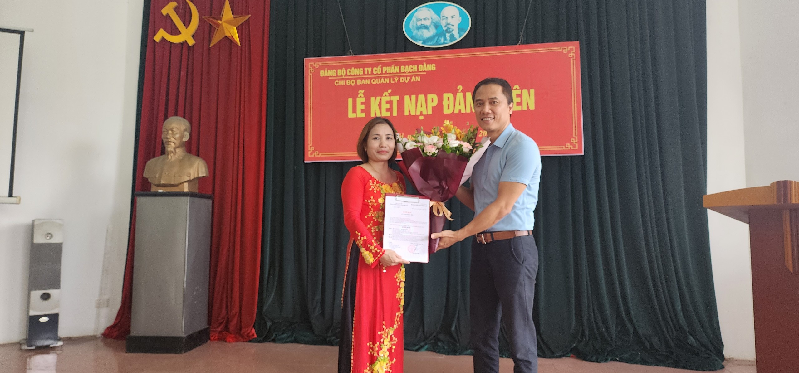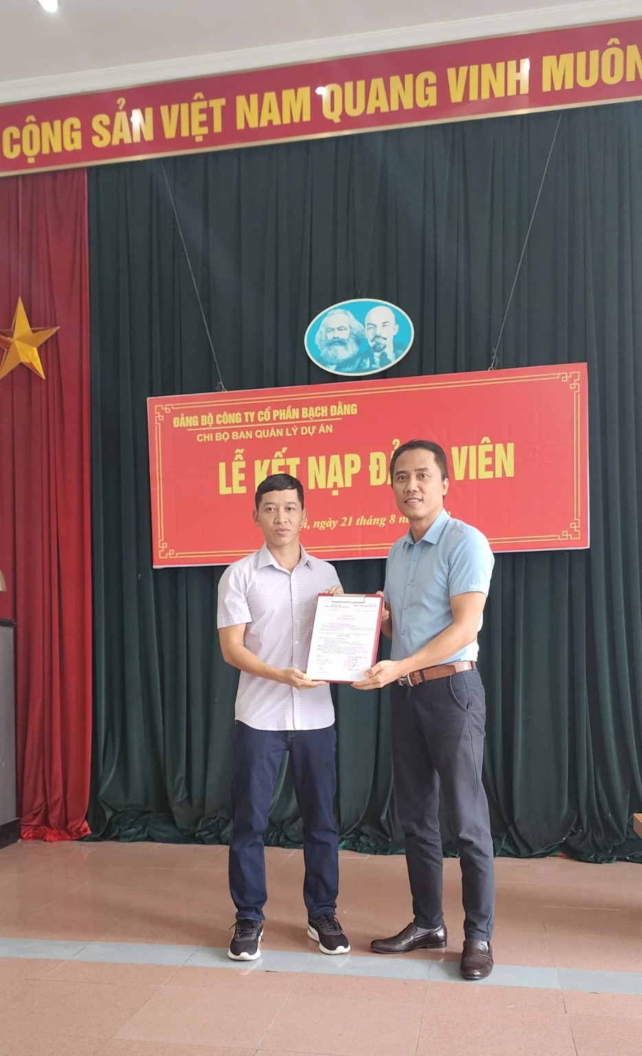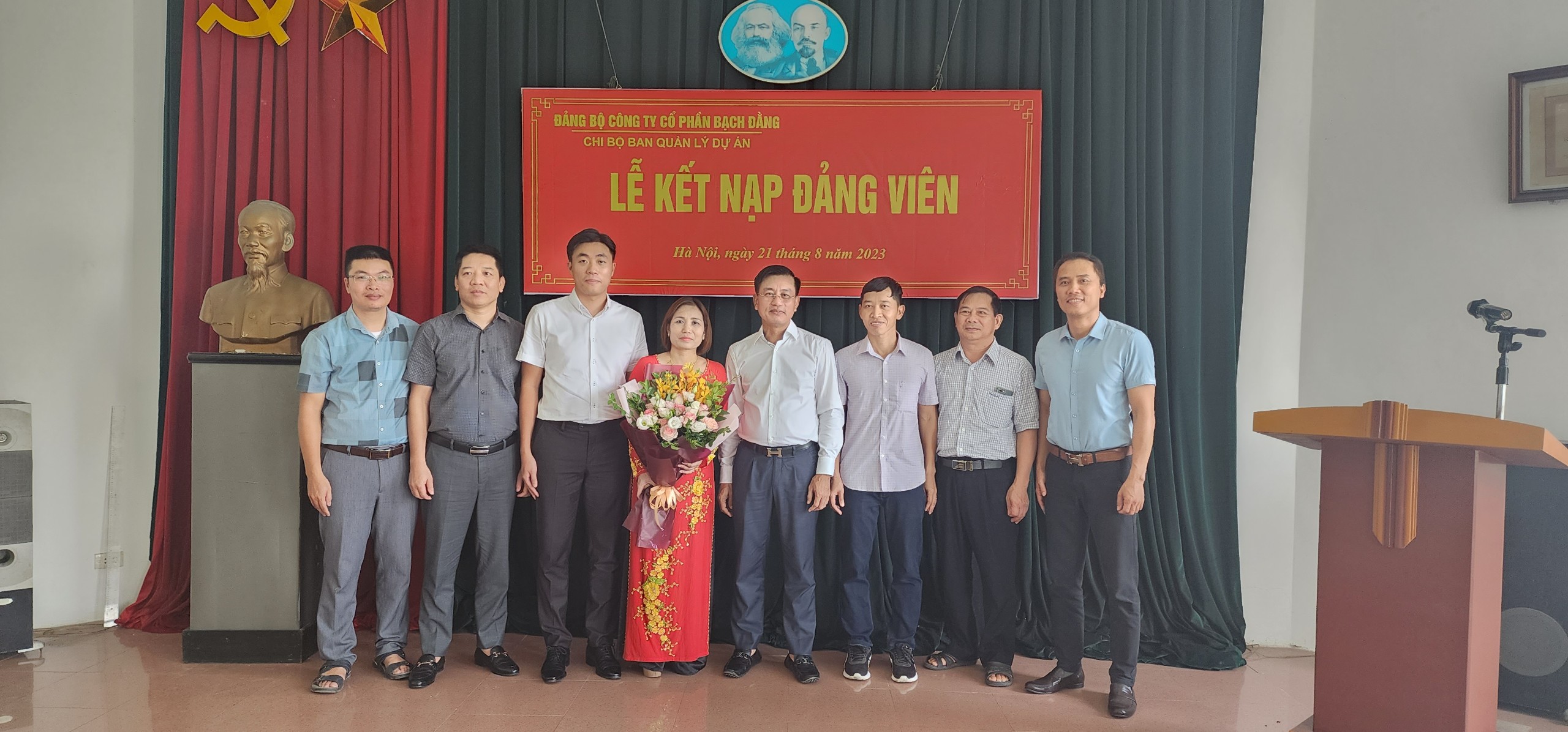 Căn cứ vào điều lệ Đảng cộng sản Việt Nam. Xét đơn xin vào đảng của quần chúng ưu tú Trần Đức Tuấn, Nguyễn Thị Xoa, Lê Quyết Thắng. Chiều ngày 21 tháng 8 năm 2023 Chi bộ công ty Cổ Phần Bạch Đằng đã tổ chức kết nạp cho quần chúng Trần Đức Tuấn, Nguyễn Thị Xoa, Lê Quyết Thắng cán bộ công ty vào Đảng Cộng Sản Việt Nam.